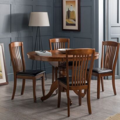 This Canterbury table brings a touch of elegance to any room, with its stylish pedestal base. Finished in a mahogany colour, this Canterbury table offers space saving practicality, extending to an oval table with can fit six people with an easy-to-use butterfly mechanism. Constructed from Solid Malaysian Hardwood, this traditional design will create a statement piece in your dning area.